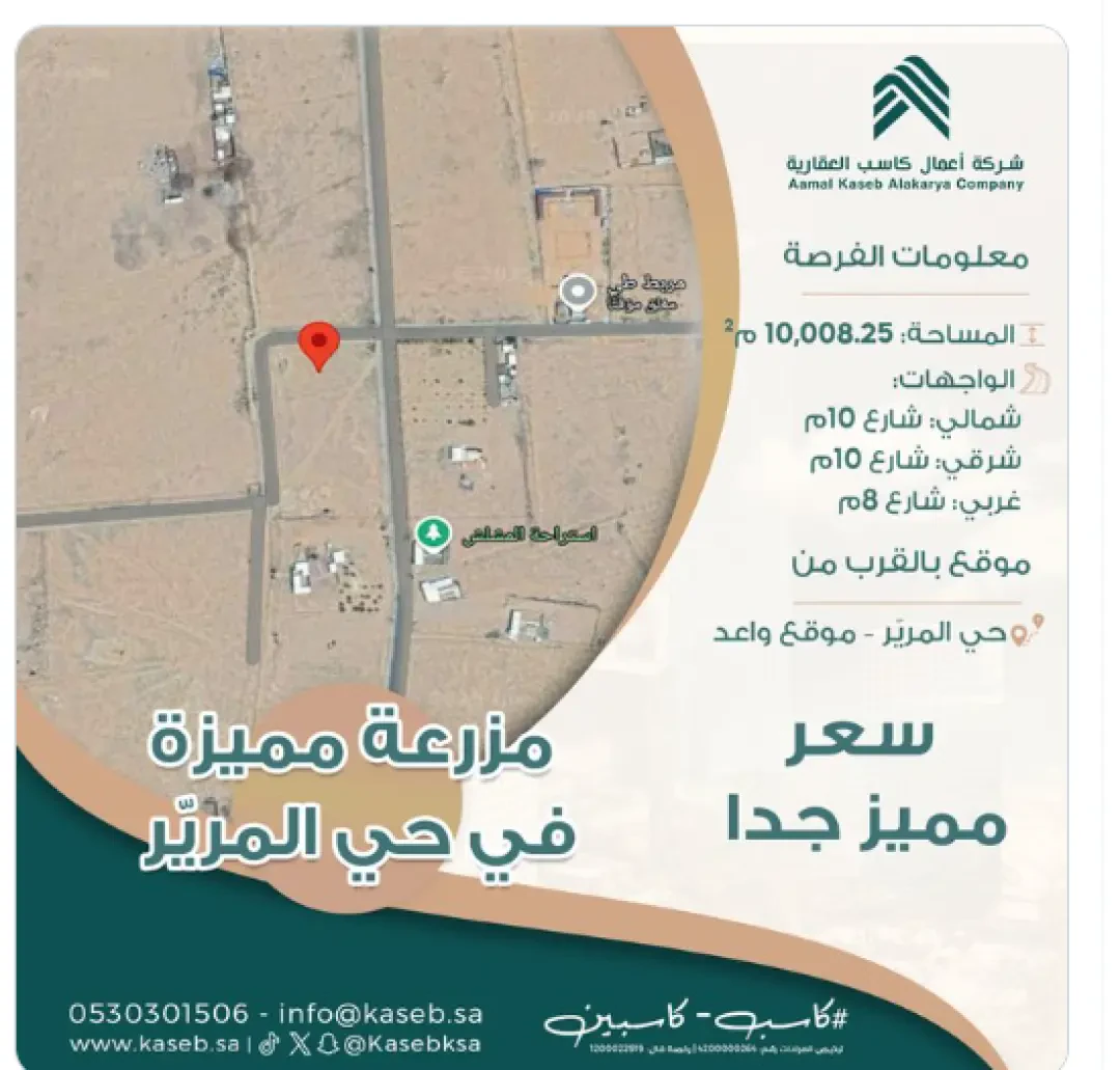 مزرعة حائل المساحة / 10,008.25متر مربع شمالي / شارع عرض 10 م شرقي / شارع عرض 10م غربي / شارع عرض 8 م في حي المرير وصل فيها الكهرباء